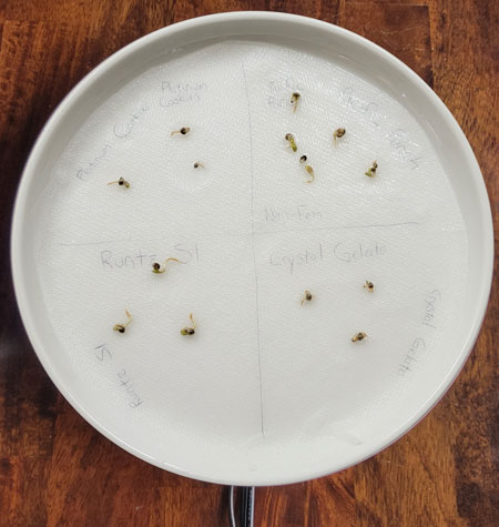 Right now I’m germinating: Platinum Cookies (U.S. Genetics), Pacific Punch (Square One Genetics), Crystal Gelato (Big Head Seeds), and Runtz S1 (Ethos Genetics).