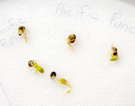 This is how seeds look once they have sprouted (through the single sheet of paper towel on top). You can faintly see their roots, and sometimes you can ever see yellow leaves. Note: the leaves are fully formed (but yellow) in the seed and break free during the germination process.