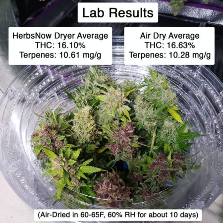 I bought one of the dryers last Spring just to prove that it wouldn’t work. I was willing to sacrifice my buds in the name of science. After harvest, I took two plants and dried half of each plant in the dryer and half in my grow tent. The dryer-buds were done in 3-4 days, while the air-dried ones took 9 days. I was shocked that the buds from the dryer seemed exactly the same as the buds dried in air. I couldn’t believe it. I decided to get the buds lab tested.
