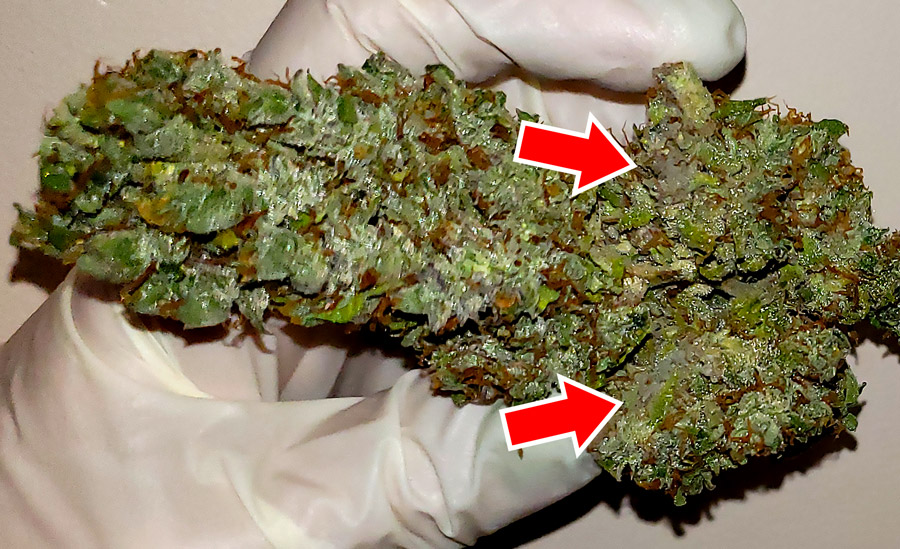 Opening up the marijuana bud lets you see the mold growing inside. Cannabis leaves fall out wherever the bud rot forms, and up close the buds look brown, gray, or moldy.