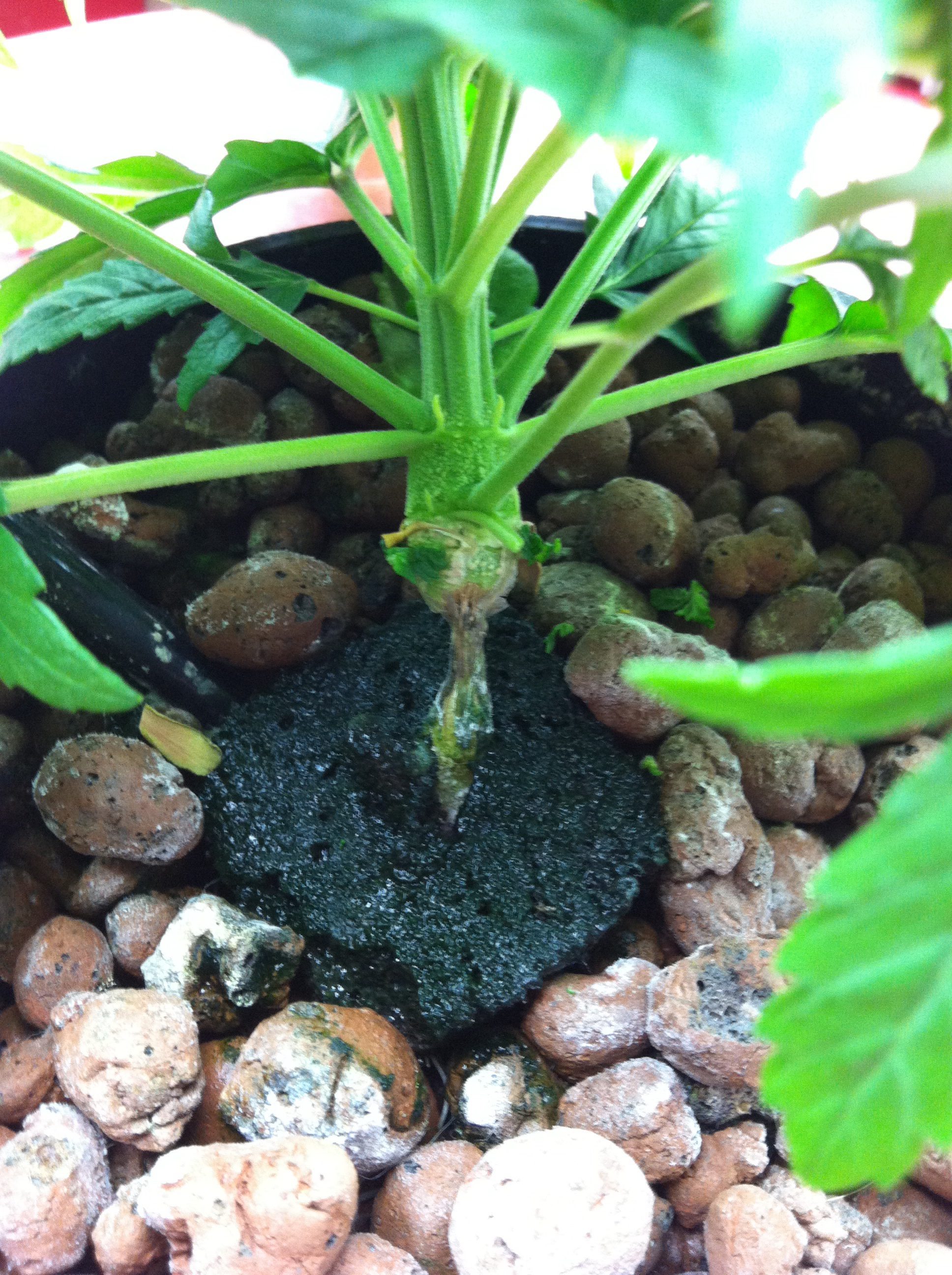 The water level in this hydroponic reservoir was so high the base of the plant stayed constantly wet (notice the dark wet Rapid Rooter). The stem rotted until the plant completely fell over.