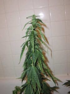 Here’s another example where the symptoms look a bit like bleaching from the grow light being too close, or perhaps a potassium deficiency, but the yellow leaves are actually the result of overwatering combined with a poor-draining grow medium.