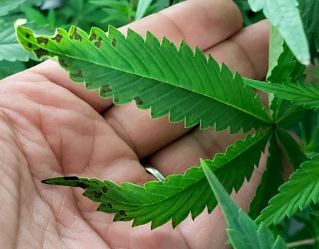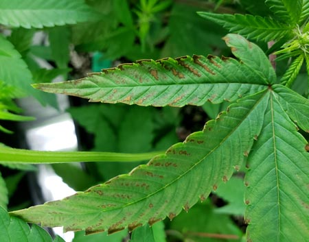 When I first started growing cannabis I heard this symptom was nutrient burn (too many nutrients), but since then, I’ve learned nutrient burn typically only affects the tips of leaves as opposed to all the edges. I’ve also heard this is a calcium deficiency, but that looks more like brown patches or burns on the leaves themselves. I’ve personally found that spots on the serrated edges of leaves are often related to root problems or issues with water movement through the plant. Most commonly overwatering, especially when combined with overly hot or cool temperatures.