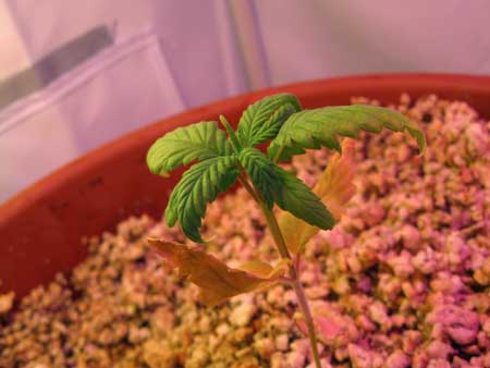 This cannabis seedling looks like it has a nutrient deficiency, but the cause is being watered too often.