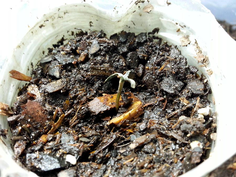 This stunted 27-day old seedling is growing slow with curling leaves as the result of being overwatered in a large container.