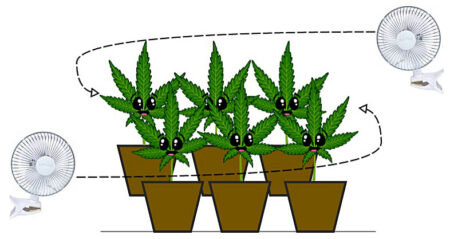 Air circulation – Make sure cannabis plants get a constant supply of fresh air so plants get the CO2 they need to grow, and keep air moving so there are no hot spots and leaves are always moving/rustling. In a smaller grow tent like a 2’x2′ or 2’x4′ size, you likely only need a single strong exhaust fan to get all the airflow you need. In a bigger grow tent like a 4’x4′, you will likely also need to add smaller fans within the grow space to help move the air around. Outdoors you may want to put up wind breaks if it gets too windy so plants aren’t being waved around.