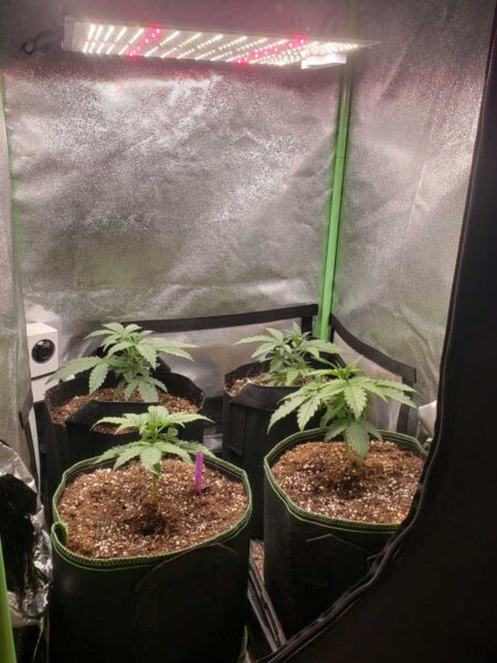 I had extra plants for each strain. I didn’t have the heart to toss them so I set 4 of them up in their own tent under an HLG 100 R-spec LED grow light in a small grow tent (2’x2’x4′ or 0.6m x 0.6m x 1.2m). I love this little LED for small spaces. Let’s see what these plants can accomplish with just 25W of light each to themselves. I think it’ll be fun to see how these ones develop in comparison to their sisters in the bigger tents that have more space and light.