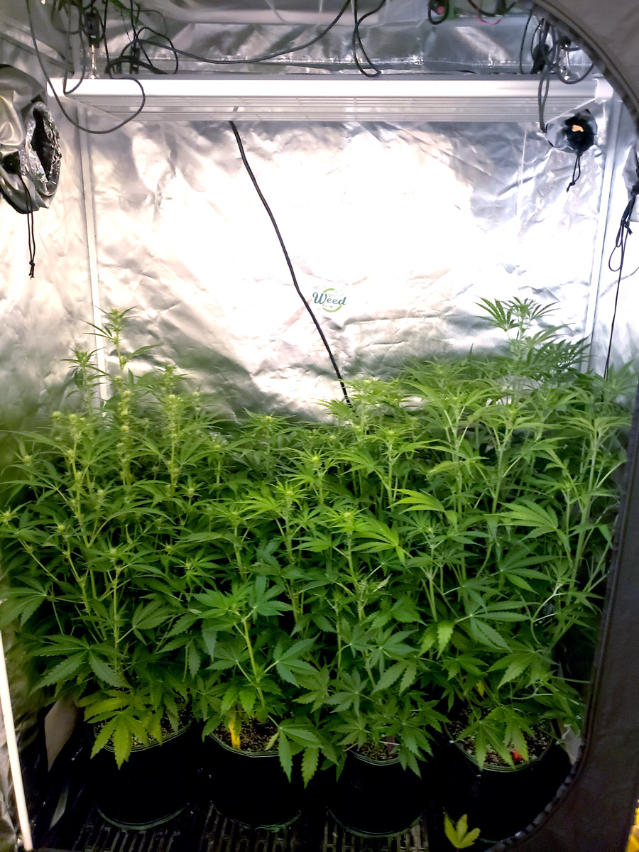 Nutrients: The plants have stopped growing vegetatively and their leaves look a little too dark so I’m reducing their nutrients starting this week from 1 1/4 tsp/gallon of Dyna-Gro Bloom to 1 tsp/gallon. I’m also going to lower the light in the trained tent. I had it 24″ (60 cm) away while they were getting taller. They’ve stopped growing now, so I’m going to lower it to 18″ (45 cm) away until harvest to help buds fatten as much as possible. In the untrained tent, some plants are further than 24″ away and others are less than 10″ (25 cm) away, so I’m just going to leave the light where it is.