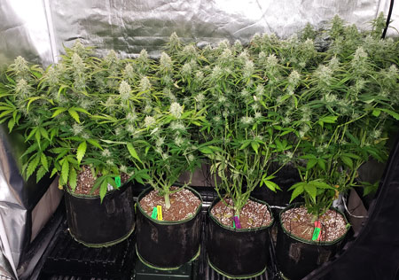 The plants were all on a 20/4 light schedule but I switched them to an 18/6 light schedule today. Although autoflowering plants grow bigger buds if they get more hours of light each day, I hope a longer night may help the plants in the untrained tent flower faster. Longer nights cause cannabis plants to “think” winter is coming and even autoflowering strains tend to develop faster under 18/6 vs a longer day.