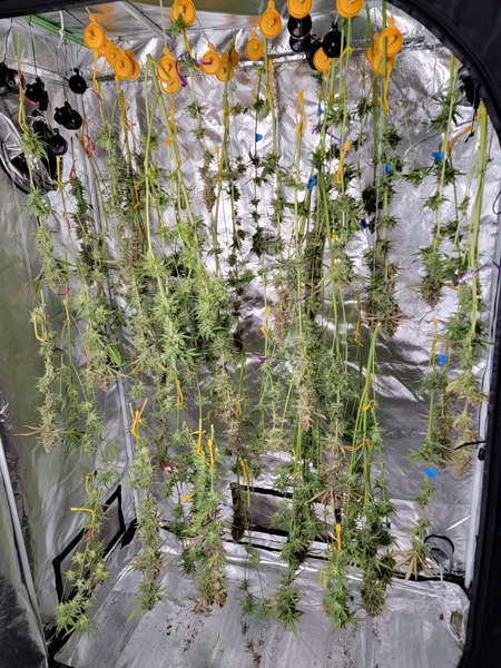 Harvested and drying in tent. Harvest went MUCH faster with this tent. The plants were much shorter than in the other tent, but once I cut off all the branches it was pretty amazing just how many fat buds each plant was hiding. I think this tent may end up winning for yields