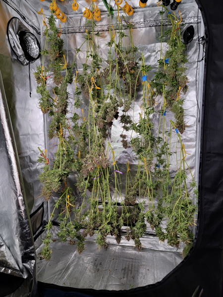 I have them all drying in their tents with the fan on the lowest setting. I also set the Air Conditioner to keep the dry room at 60°F (15.5°C) and the humidity in the tents is almost exactly 60% RH. I’ve had the best luck air-drying in 60°F/60% RH (never mold, never harshness) so I’m pleased with the current drying conditions. The buds should take about 10 days to dry at this rate. Then the weigh-in and finally the lab test results!