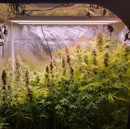 The LED is currently at the top of the tent and can’t be moved up any further. The Sour Diesel Auto plant on the far right has essentially grown into the panel. So far it looks surprisingly green and healthy, but I suspect the top leaves will start turning yellow and dying early from the intense light levels, especially since I know that cannabis plants get less and less resistant to plant problems throughout the flowering stage.