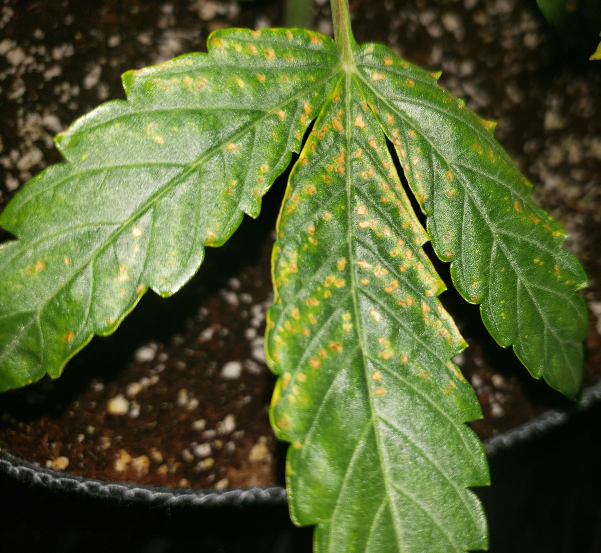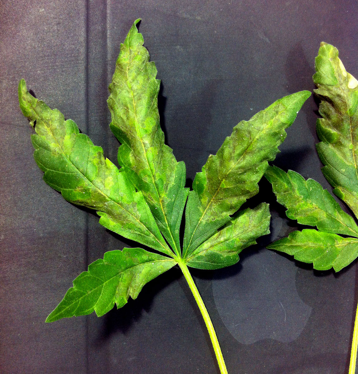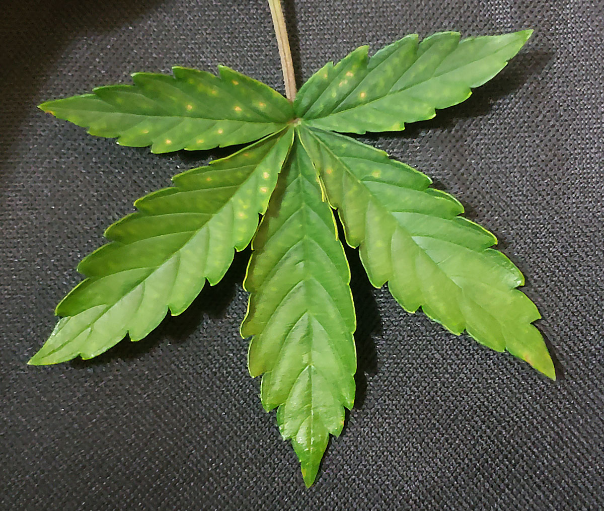 Here is another leaf in that same tent on a different plant. Low pH can cause a variety of similar symptoms, but not every plant reacts the same even in identical conditions. Notice the bright red-purple coloring on the leaf stem.