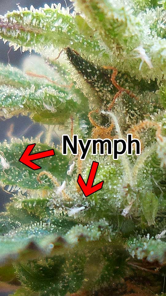 Aphids are a common cannabis pest. Adults are usually small and oval-shaped and may have visible wings or antennae. Nymph aphids are thin/long and usually white or pale. Because nymphs are so small, they may look like little white specks or eggs.
