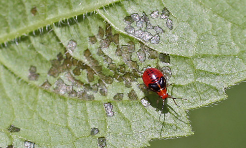 Example of a nymph (baby) – Four-lined plant bug nymphs are reddish and active. If you see these, it means the adults are coming next.