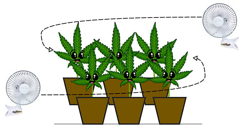 Air circulation – Make sure cannabis plants get a constant supply of fresh air so plants get the CO2 they need to grow, and keep air moving so there are no hot spots and leaves are always moving/rustling. In a smaller grow tent like a 2’x2′ or 2’x4′ size, you likely only need a single strong exhaust fan to get all the airflow you need. In a bigger grow tent like a 4’x4′, you will likely also need to add smaller fans within the grow space to help move the air around. Outdoors you may want to put up wind breaks if it gets too windy so plants aren’t being waved around.