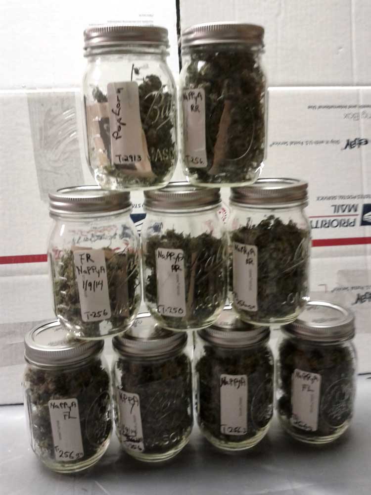 Final harvest in jars - about 5 ounces of premium bud, plus lots of popcorn buds and trim to make edibles with