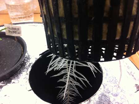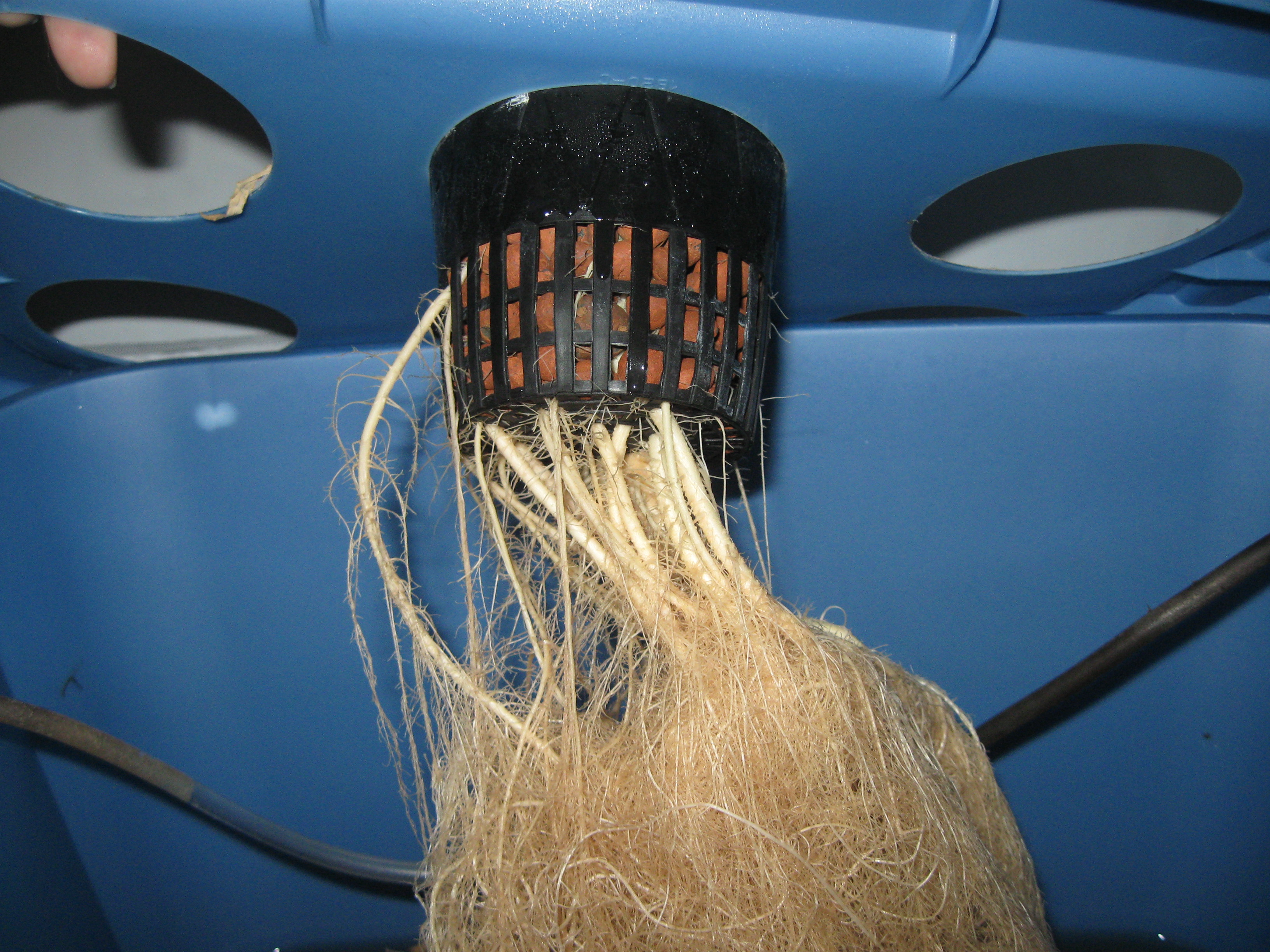 If you see green roots, it usually means light is getting into the reservoir. In this case, the lid was so thin it was letting in light. The grower covered the top of the lid with aluminum foil, and light stopped getting to the roots.