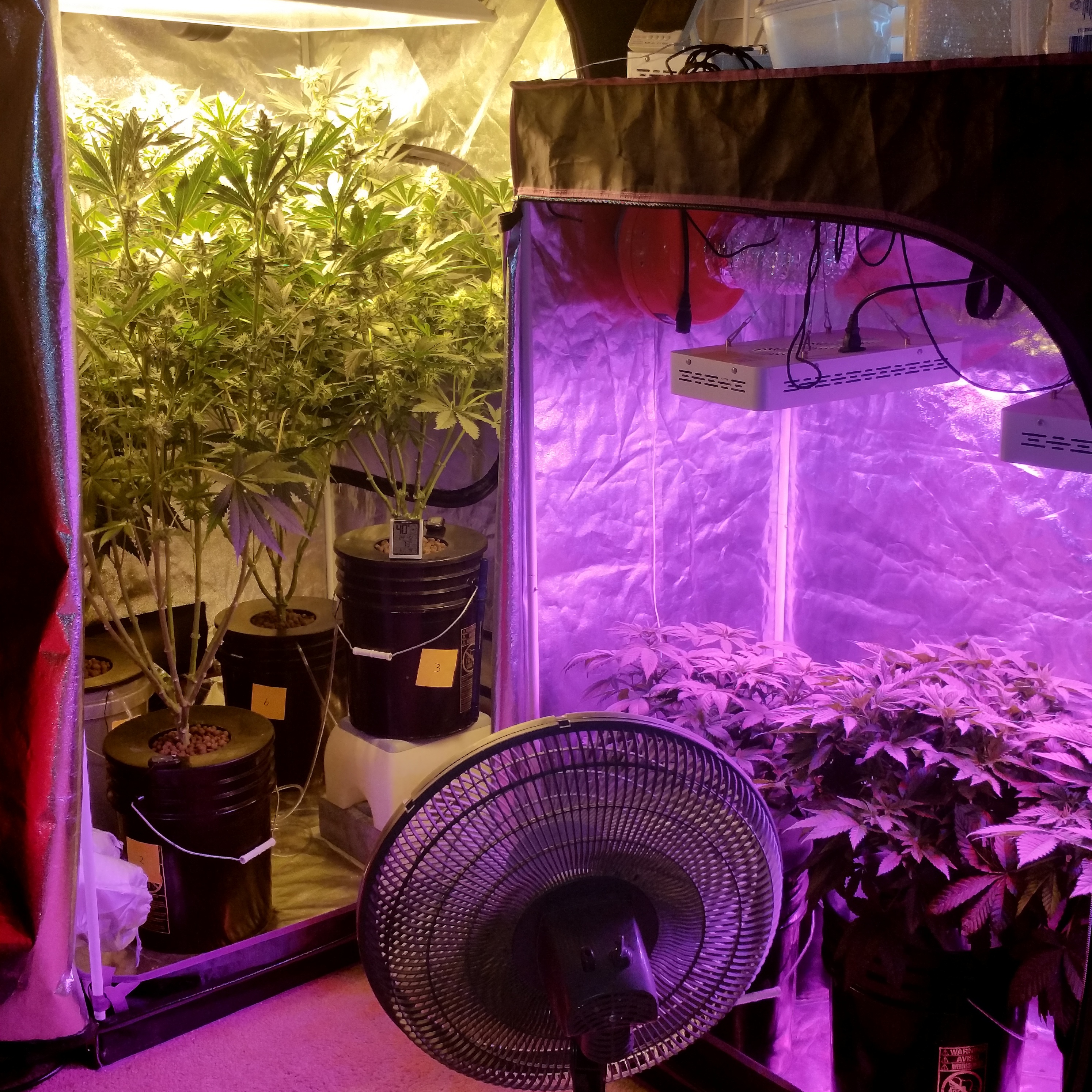 A 4x4 grow tent with HLG LEDs, growing cannabis plants in hydro tubs