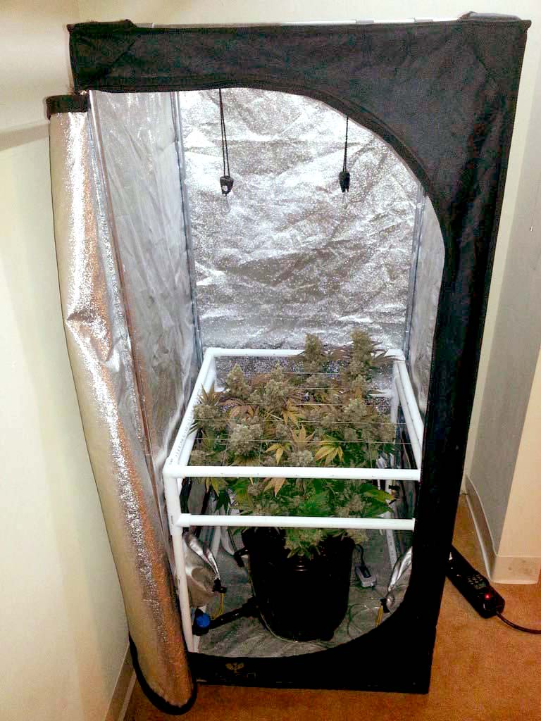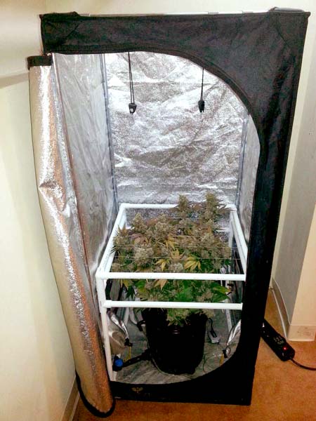 • Grow in a grow tent, because they have a waterproof tray at the bottom which can hold many gallons of water. That means if something happens and there’s a spill, none of it will get on your floor. Bonus: if you get a grow tent you can also control smells and you get bigger yields because reflective walls bounce more light onto your plants