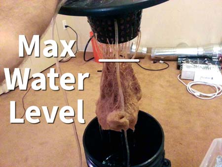 Even though these are “5 gallon buckets” they cannot be filled to the top. You need to keep the water levels several finger widths below the bottom of the net pot. Then the roots themselves displace the water so you can add even less.