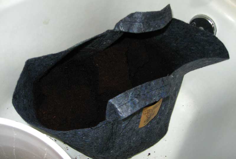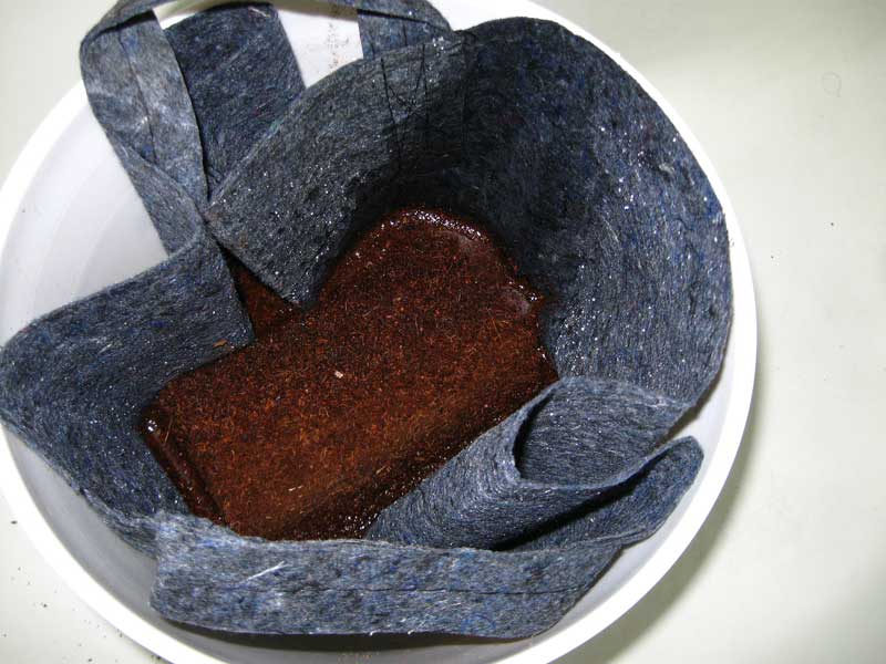 I use a 10-gallon fabric container from Mad Farmer (basically a Smart Pot by a different company) because it’s sturdy, has handles and will stand up on its own after adding coco coir. You could use a 10-gallon Smart Pot, two pillow cases stacked inside each other, or any other fabric container that lets water through and is tough enough to hold 5 gallons of soil.
