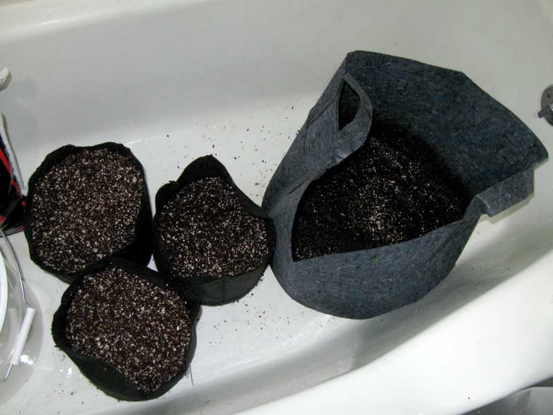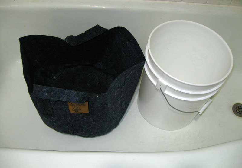 Here’s the 10-gallon fabric pot & 5-gallon bucket in a bathtub.