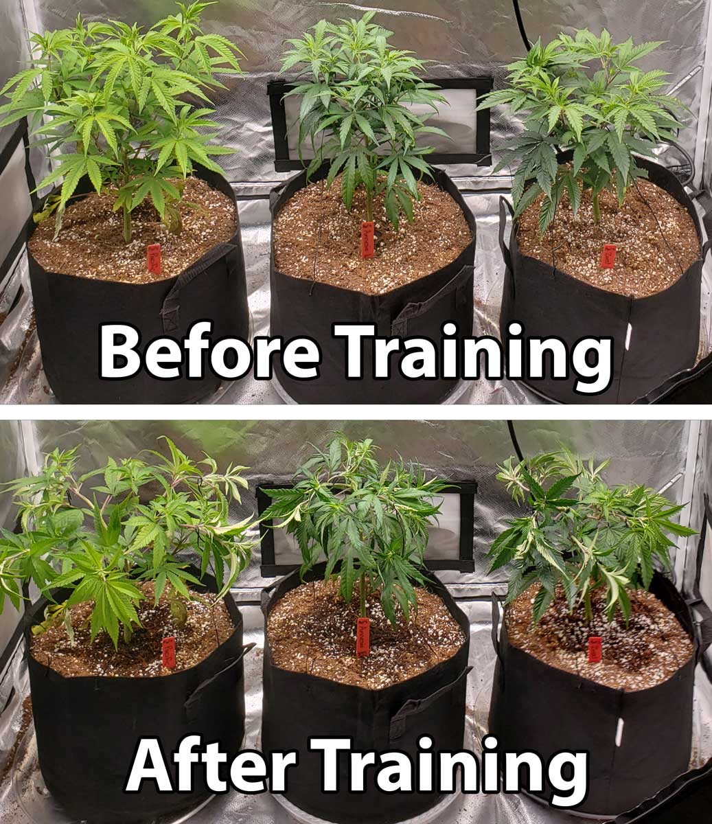 Training: You can still train plants by gently bending too-tall colas, but avoid any major training once the plant has started making buds.