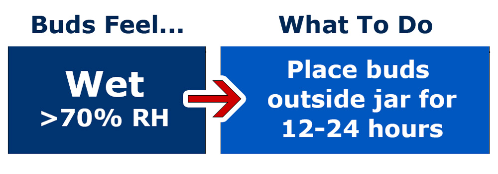 A great way to make sure buds don’t contain extra moisture is to leave your cured buds in unopened jars for a few weeks first, to make sure the humidity reading is completely accurate before your store your buds somewhere you won’t be able to easily check. Adding a Boveda 62 humidipak to the jar will also help keep the humidity where it needs to be!