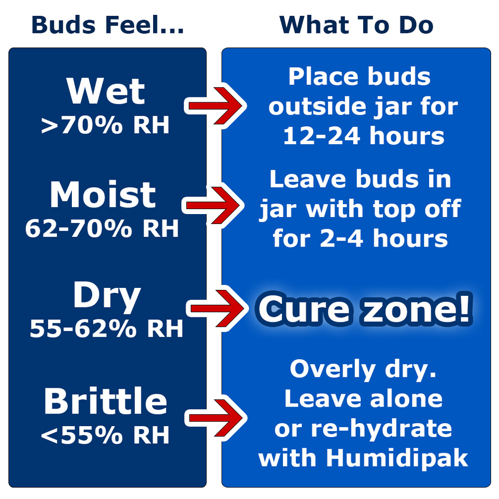 Buds should feel dry and have been curing for at least 3 months before any attempt to store them long term. It is better to err on the side of buds being too dry when you’re going to store buds for a long time without checking on them. Even if buds get brittle, they can be “freshened up” later with a Humidipak.