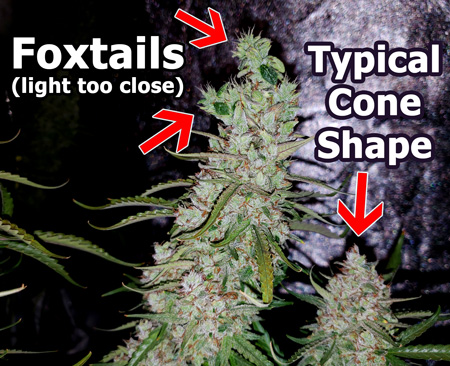 The second cause of foxtailing is environmental and it’s usually caused by your lights being too close. If you’ve ever parked a high-powered HPS, LEC, CMH, or LED grow light (fluorescent lights like CFLs and T5s aren’t usually strong enough) too close to your cannabis, you might see buds grow these odd spires.
