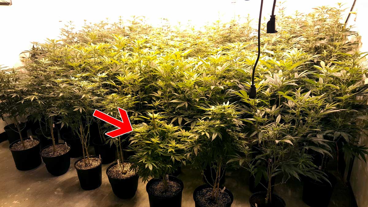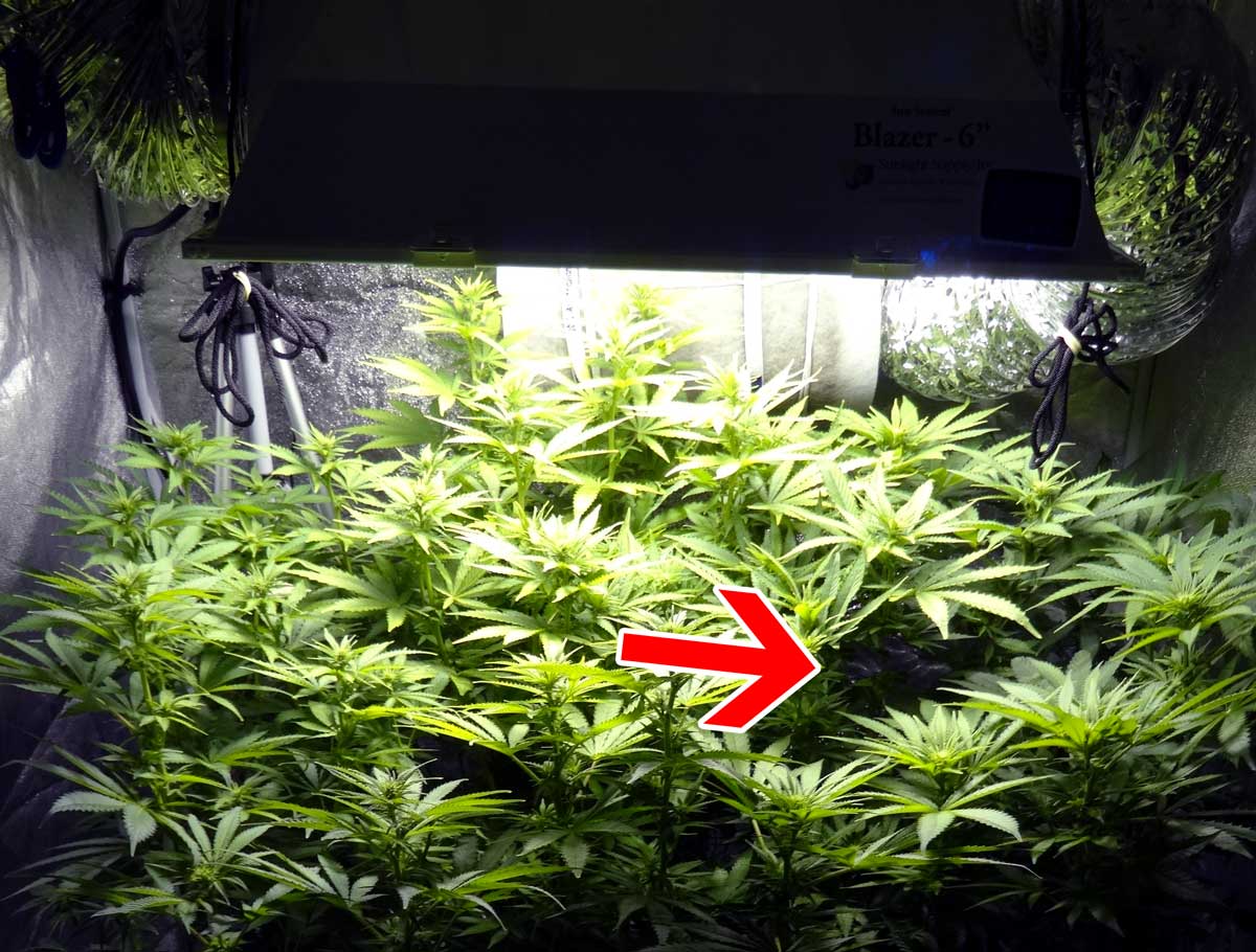 This arrow points to an example of an empty spot in the cannabis canopy.