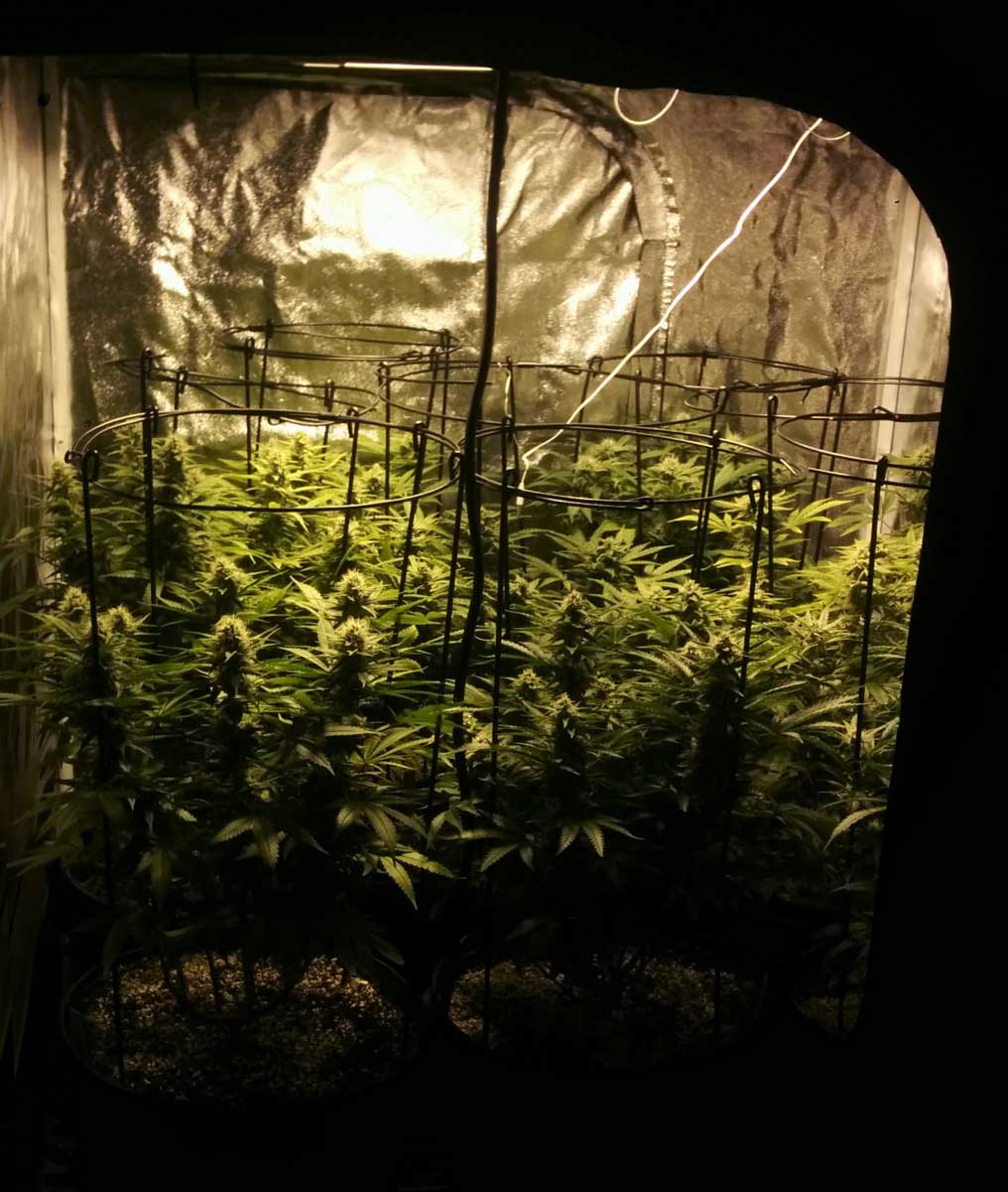 These pictures by commercial grower Davie Jones help illustrate how stakes can be used to support the plants and keep the canopy relatively flat and even. He started with several cannabis plants of different strains.