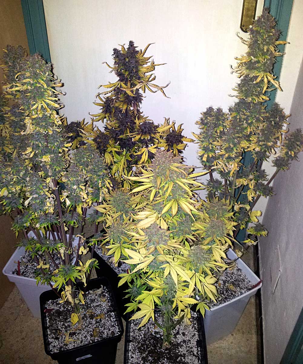 From left to right these cannabis strains are Power Africa, Peyote Critical, and Critical Purple Kush.