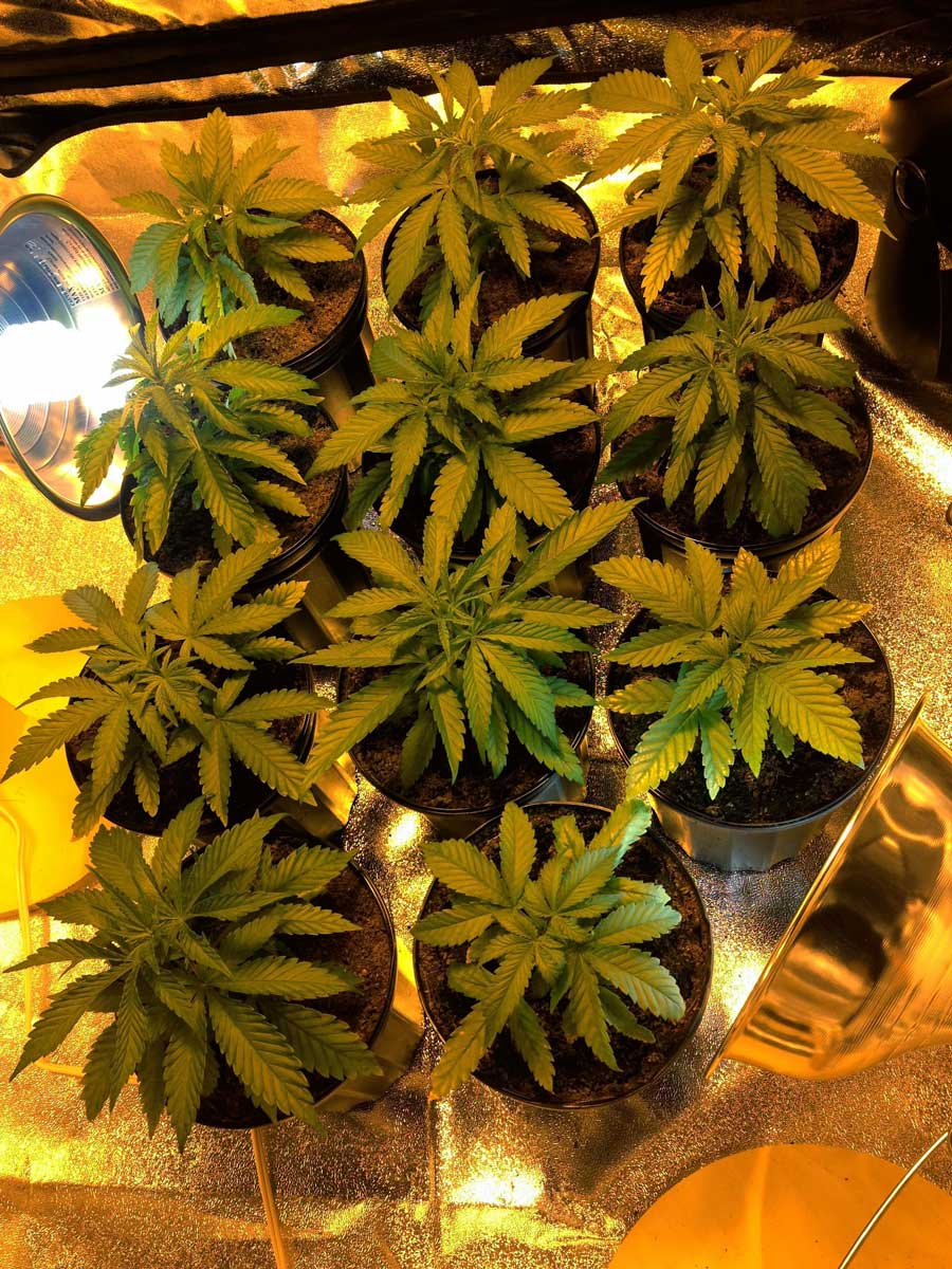 The grower had to toss 4 plants that were males or hermies, but even with just 7 plants left, the entire bottom of the tent is soon covered from wall to wall. A few days after this picture, the grower put these plants in bigger containers and switched to a 12/12 light schedule to initiate the flowering stage.