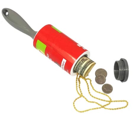 The fake lint roller by “Safety Technology” is the most realistic version I’ve seen. It has a handle that is shaped like this, and usually says “Scotch Brite” on the design. These actually work as a lint roller, and just look like a regular roller, though cost $30-40 unfortunately.