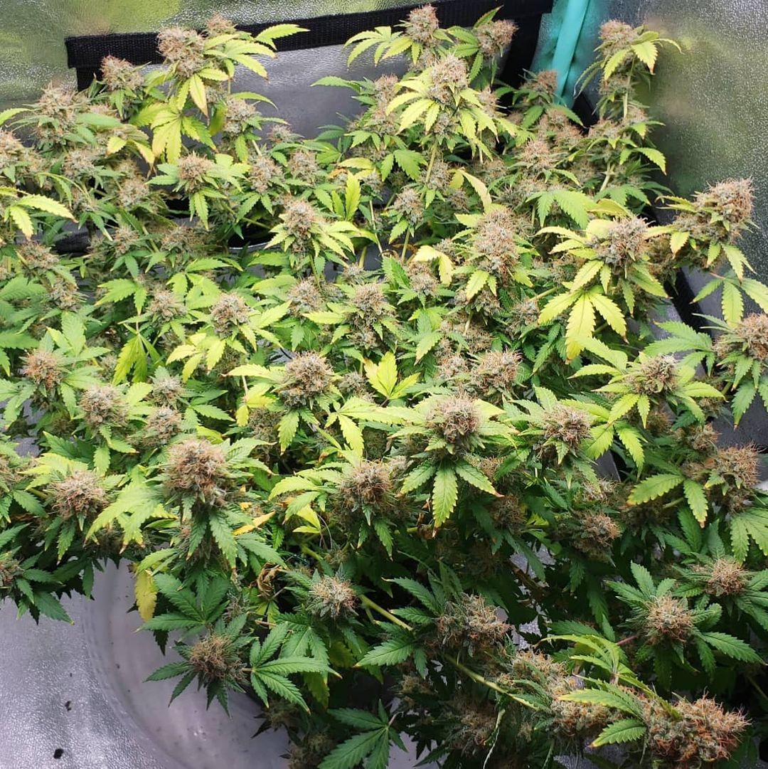 The sister plants to those out-of-control plants (same strains in a different tent) show the power of training to reduce the flowering stretch. These plants were trained to be short with multiple branches per plant (instead of just one main trunk like the above example). Not only does this keep plants shorter overall, but it also reduces the amount of height gained during flowering since the upward growth gets spread between many branches at the same time.