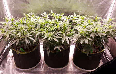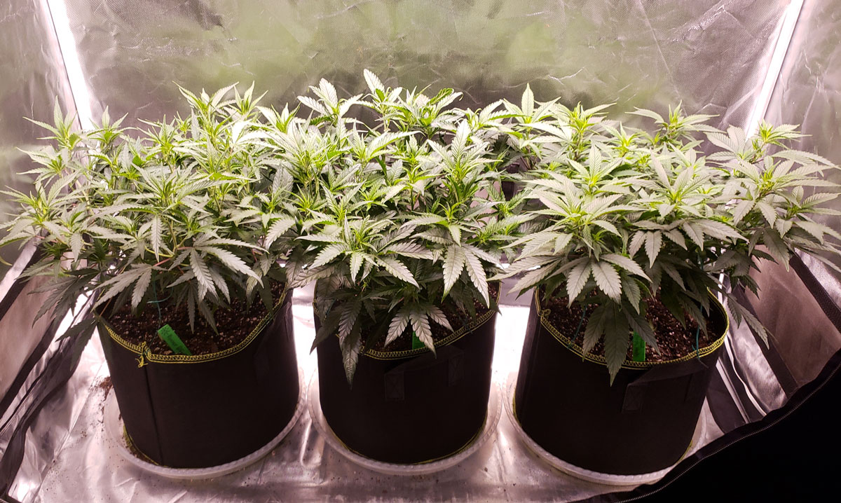 Pot size – Smaller pots (restricting root size) will help keep plants smaller. They can still get big if you keep them watered and happy, but it will take them longer to get big compared to a plant with unrestricted roots. For example, if given the exact same conditions and amount of time, 1-gallon pots tend to keep plants small, 3-gallon pots tend to produce mid-size plants, while 7-gallon pots can produce humongous plants indoors. I usually grow with 1 or 2-gallon pots in a mini tent, 3 or 5-gallon pots in a 2’x4′ grow tent, and 5-gallon pots in a 4’x4’x6.5′ grow tent. Note: smaller pots need to be watered more often so there is a tradeoff.