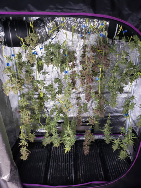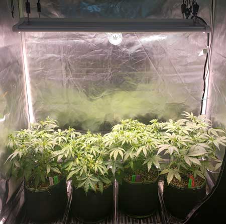 Cannabis plants grown in a 4’x4′ grow tent under a 600W HPS.