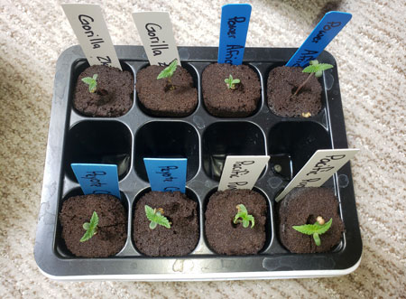 When starting with feminized seeds (which means all plants will be female and make buds) I germinate at least one extra seed per strain just in case a seed doesn’t germinate. If I’m sprouting non-feminized (“regular”) seeds, I germinate 4-5 seeds per strain to ensure there’s at least one female plant. Even though about half the plants from regular seeds should be female, sometimes you get unlucky and get a lot of male plants (which don’t make buds). If you don’t want to worry about male or female plants, I recommend sticking to feminized seeds so every plant ends up being female.