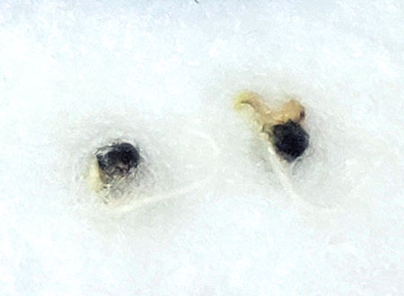 This is how seeds look once they have sprouted (through the single sheet of paper towel on top). You can faintly see their roots, and sometimes you can ever see yellow leaves. Note: the leaves are fully formed (but yellow) in the seed and break free during the germination process.