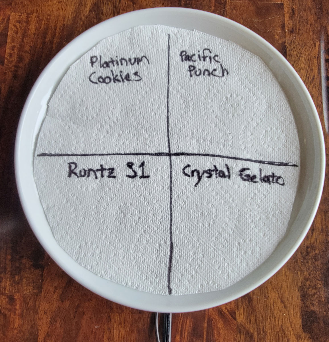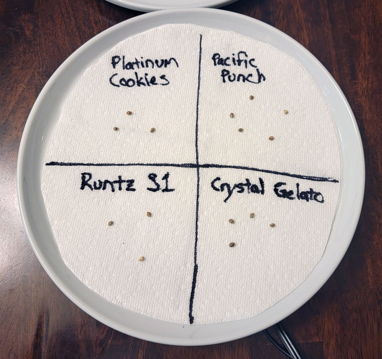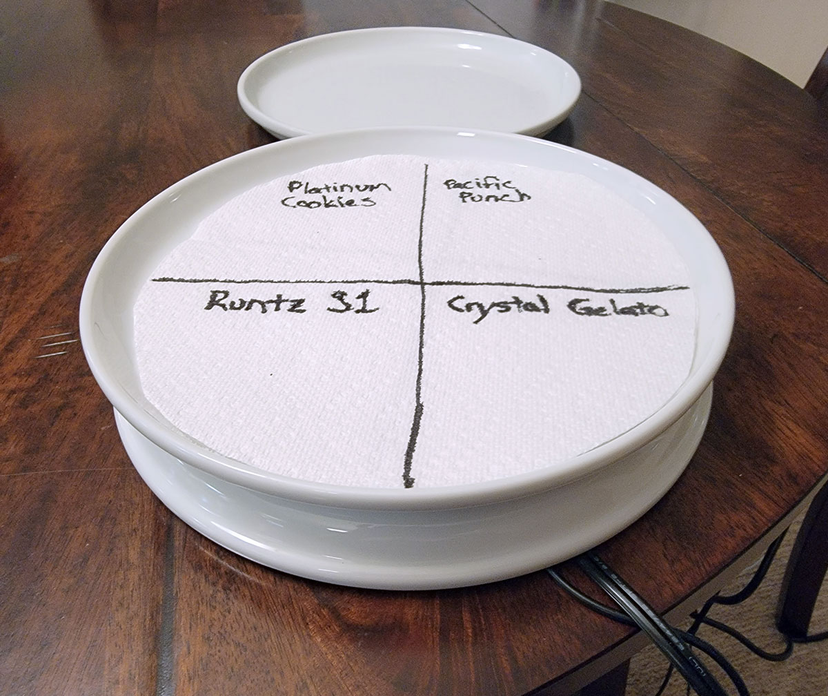 Right now I’m germinating: Platinum Cookies (U.S. Genetics), Pacific Punch (Square One Genetics), Crystal Gelato (Big Head Seeds), and Runtz S1 (Ethos Genetics).