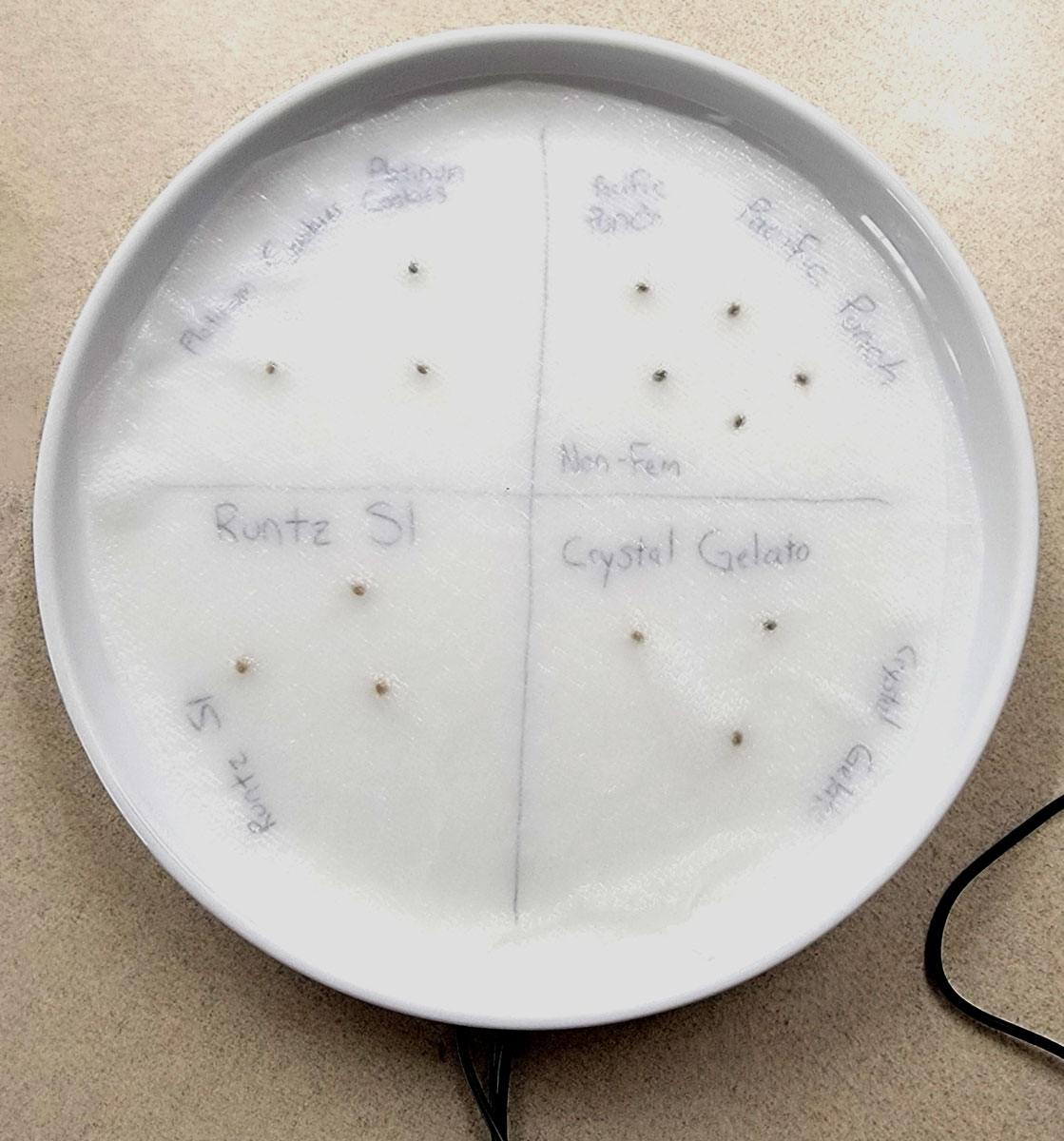 Cut your paper towels to fit your plates (if any paper towel is sticking out, it will dry everything out) and label them with the names of seeds.