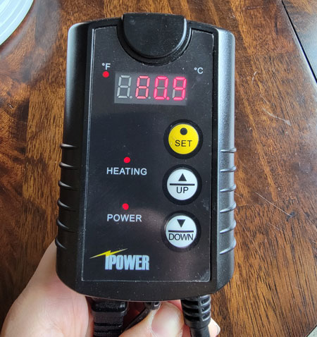 I set the reptile heater to 83°F / 28°C, but anything around that range works great. Here’s a quick video showing how to set the controller. Hold the “set” button until it blinks, set the temperature you want, then hit “set” again. You’re good to go!