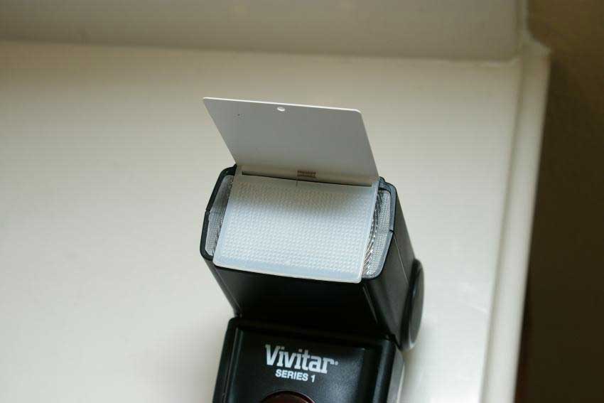 If you have the kind of flash that attaches to a DSLR camera, here’s a good way to mute the flash: Fold an index card in half, then stick it above the flash lens so the card is perpendicular to the flash. Then point the face of the index card towards what you’re taking a picture of. This causes a bounce flash which can produce stellar results.
