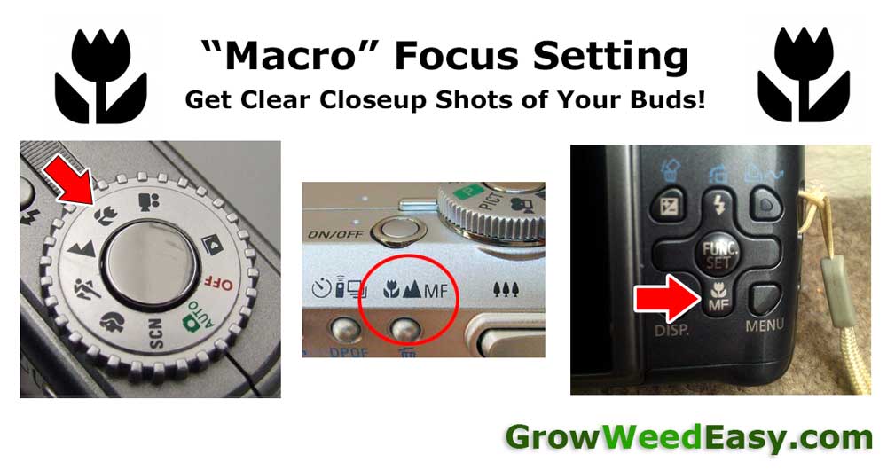 Does your camera have the “Macro” focus setting or mode? Coincidentally (we’re taking pictures of flowers after all!) a flower is the universal symbol/icon for macro mode. It can appear in a couple of different places on your camera, as demonstrated by the picture below.