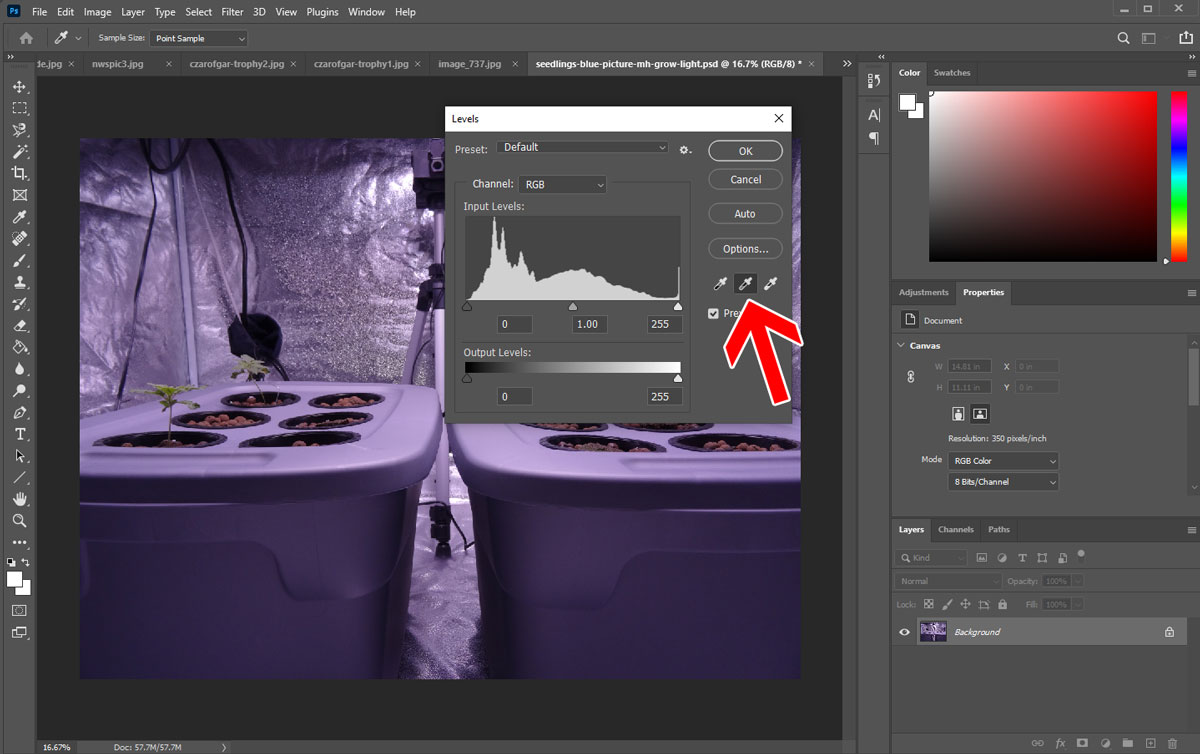 You can make this easier by setting up a little before you start shooting pics. If you place something in the scene that is known to be black, gray or white, you can use that as a reference when correcting levels. For example, if you have a white piece of paper in the picture, you can use that as the correct “white.” In the above pic the tub on the right is gray, so I know I can use at as my “gray” reference. The net pots are black in real life, so I use them as my new “black.”