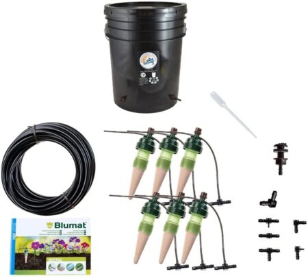 The “Blumat Drip System” is a complete gravity-based autowatering system. It can be confusing because it uses the term “drip” but this is actually a passive/gravity watering system like the stakes, just provided in a way so you can easily use the system on many plants instead of having to give each plant its own line to the reservoir of water.