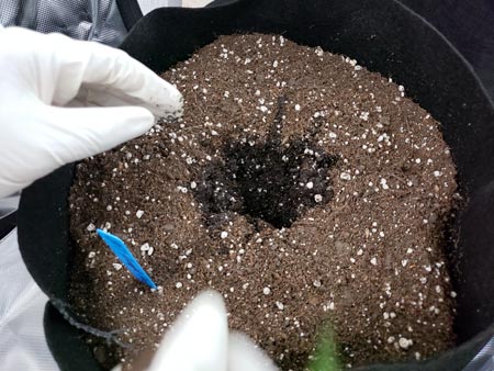 Fill the bottom of pots 1/3 of the way with super soil mix (about 1 pound of super soil concentrate per 5 gallon pot, mixed partially with regular soil as stated on the directions)