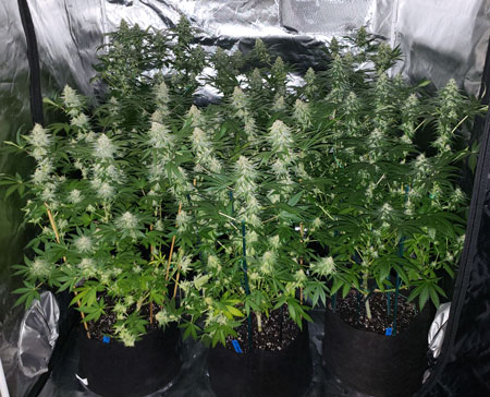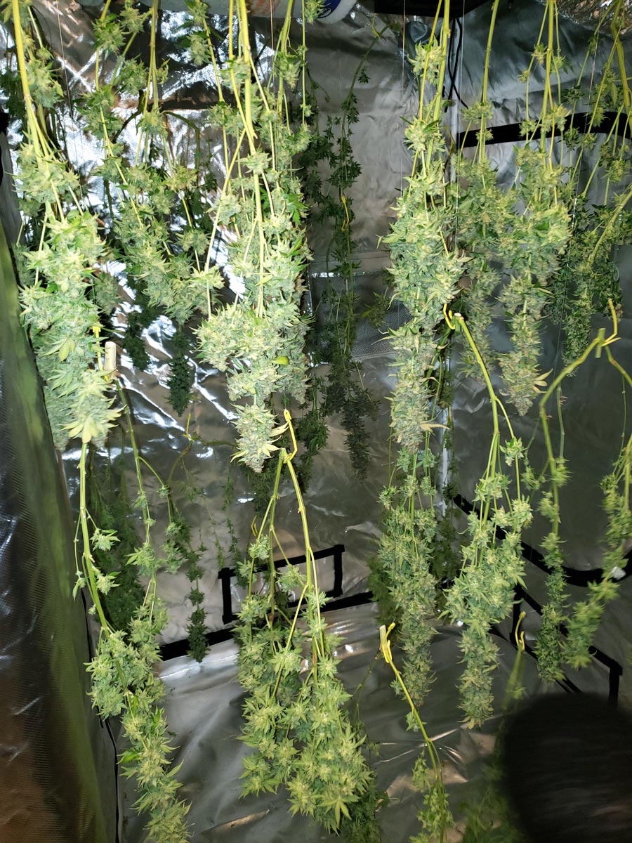 Here are the plants just before harvest, about 9 weeks after initiating 12/12. What are those strings? We needed plant yo-yos to help hold the branches up because the buds were falling over.